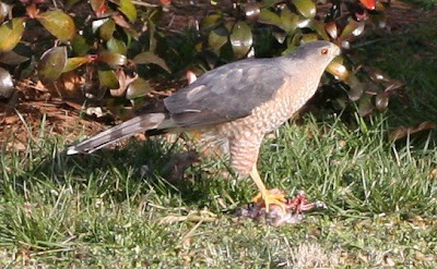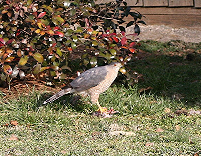 This little hawk was in my yard this morning. I tried slowly creeping closer but couldn't get less than about 80ft. away from it. Of course it knew I was there all the time but waited until I got to a certain point to take off.